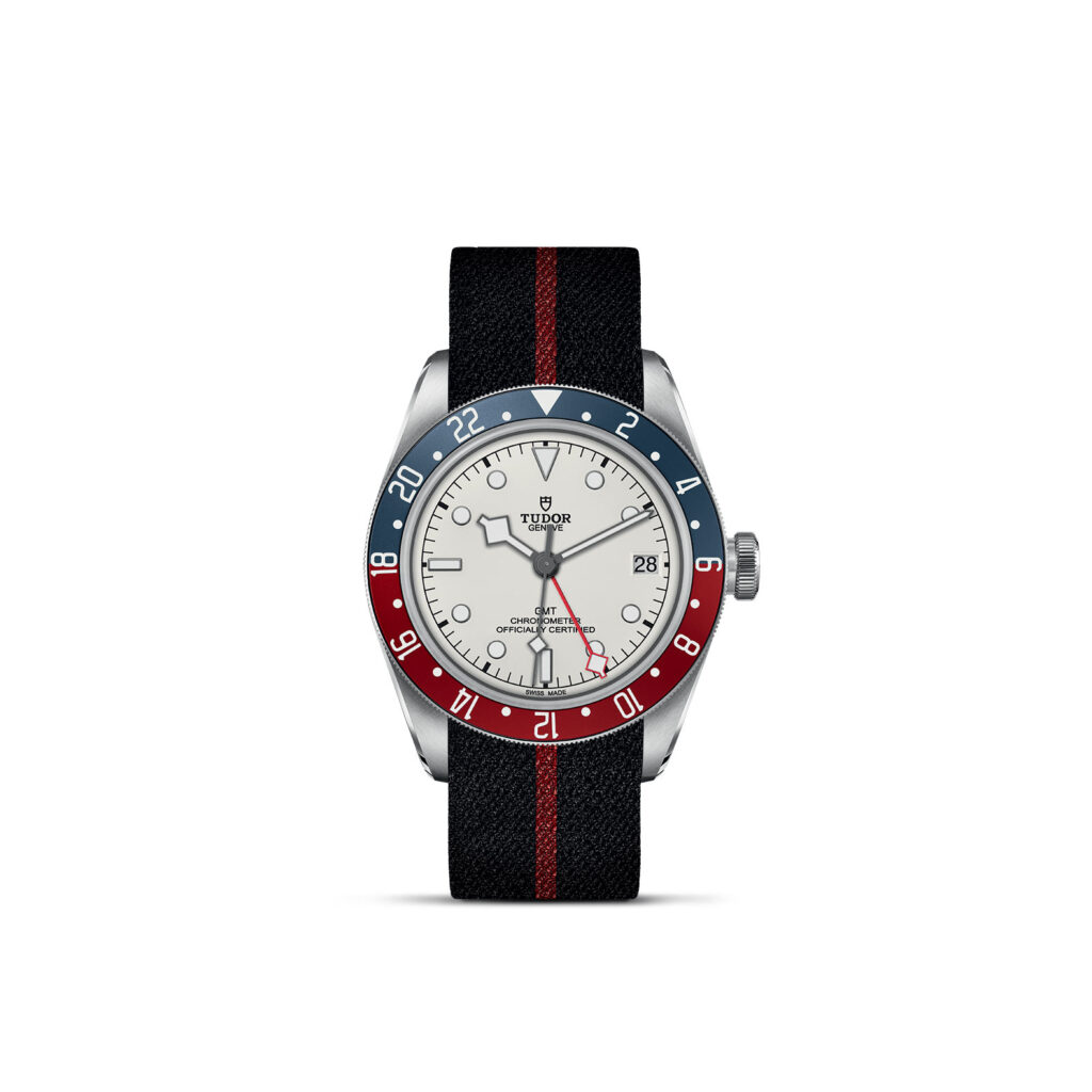 Bezel: Bidirectional rotatable 48 notches bezel in steel with 24-hour graduated anodized aluminium disc in matt burgundy and blue